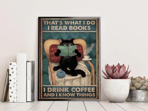 Read Books And Drink Coffee Black Cat Vertical Poster Cat Lover Gift Cat Home Decor Cat Wall Decor Cat Wall Art