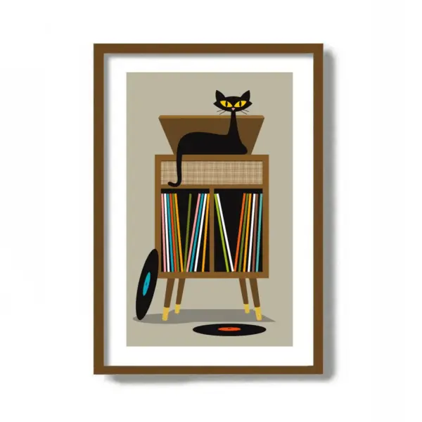 Record Player Stand Mid Century Modern Art Black Cat Art Print Cat Poster Mid Century Modern Decor Cat Lover Gift Vinyl Record Storage