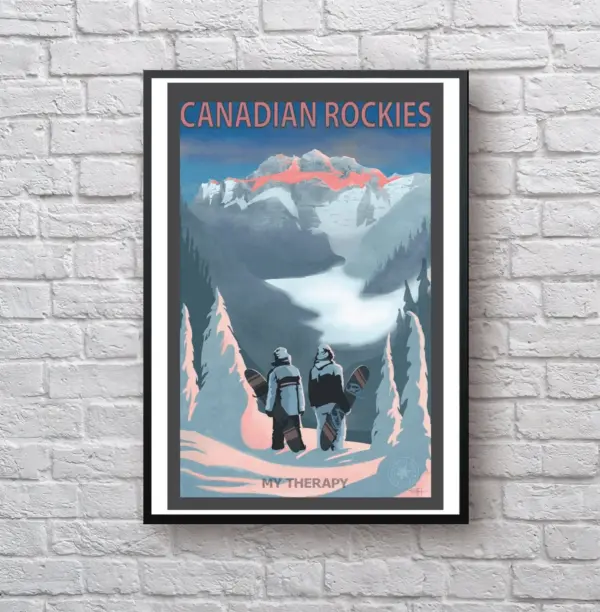 Capture the thrill of snowboarding with this stunning Canadian Rockies landscape poster featuring breathtaking mountain scenery and winter adventure vibes.