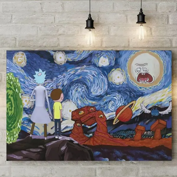 High-quality Rick and Morty poster featuring Van Gogh's Starry Night. Perfect wall art for fans! Prints available in various sizes.