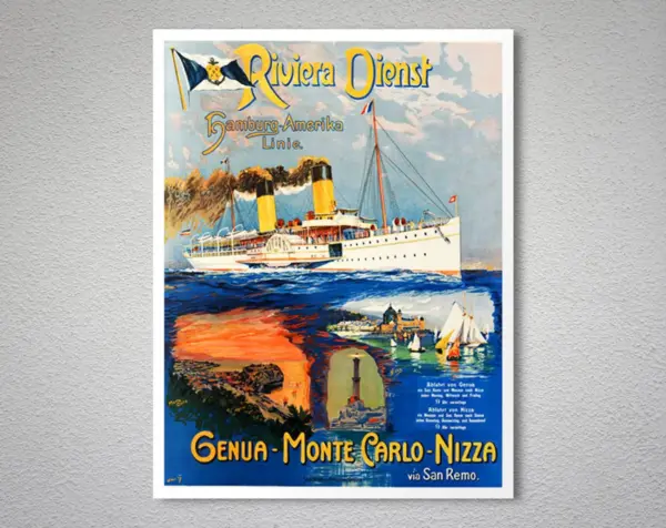Vintage travel poster art print featuring Riviera, Hamburg, Monte Carlo, and Nizza. Available as poster, sticker, or canvas print. Perfect gift idea!