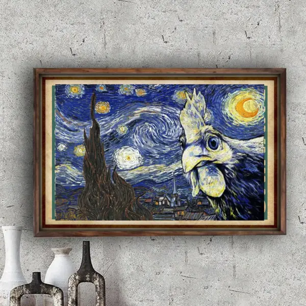 Bring the beauty of Van Gogh's Starry Night into your farmhouse home with this unique rooster-themed poster. High-quality print, perfect for wall art and home decor.