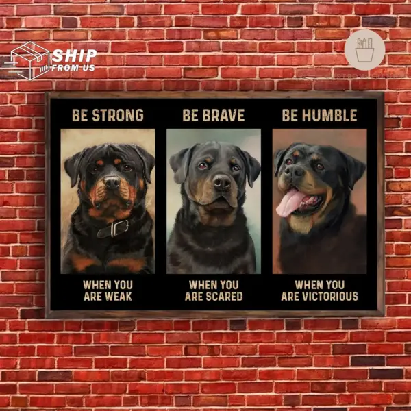 Inspiring Rottweiler poster with powerful motivational message, perfect for dog lovers seeking strength and courage in home or office wall decor.