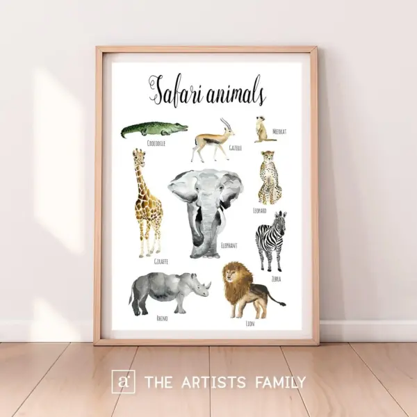 Safari Animals Downloadable Prints Watercolor Montessori Educational Posters Kids Boys Girls Children Rooms Learning Painting Illustration