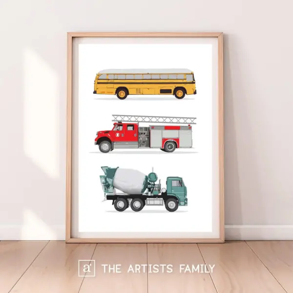 School Bus Fire Truck Cement Truck Downloadable Prints Posters For Kids Boys Nursery Rooms Learning Transportation Illustration Printable