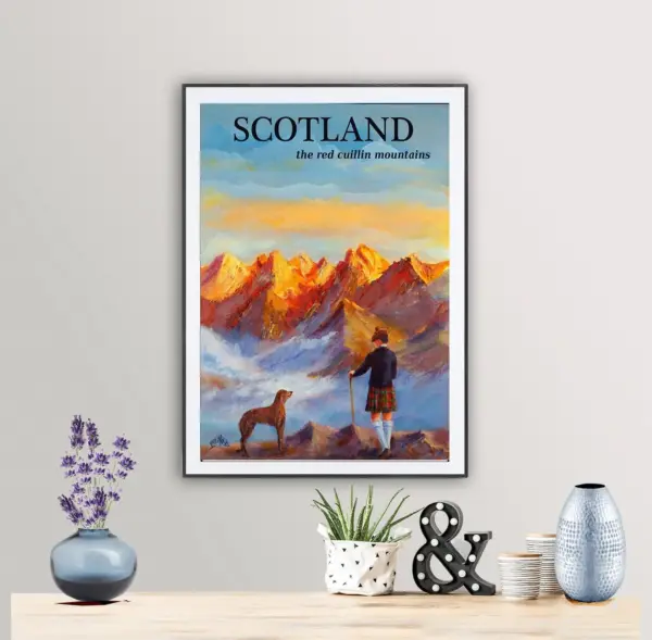 Scotland The Red Cuillon Mountains Vintage Travel Poster By Faruk Koksal Poster Paper Sticker Or Canvas Print Gift Idea
