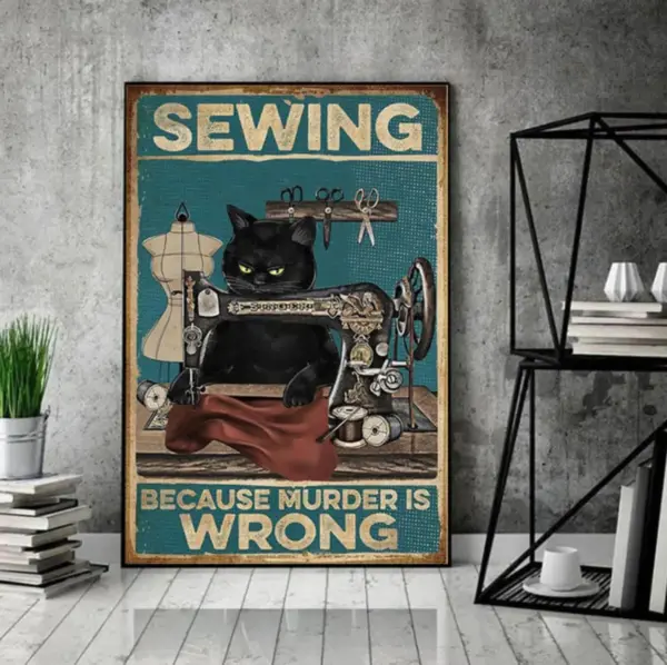 Sewing Because Murder Is Wrong Poster No Frame Black Cat And Sewing Machine Sewing Lover Cat Lover Gift Vintage Wall Art Print 3