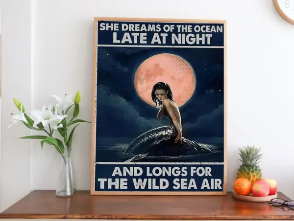 She Dreams Of The Ocean Late At Night Poster Mermaid Painting Mermaid Poster Mermaid Wall Art Best Gift For Mermaid Lover