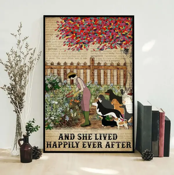 She Loves Garden And Dogs Poster And She Lived Happily Ever After Poster Lovely Girl Poster Dog Lovers Gift Love Garden Print 1002