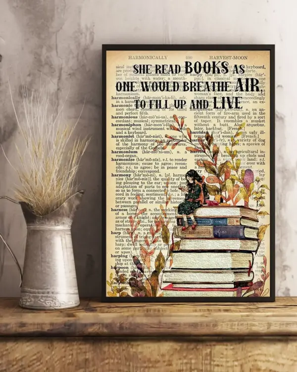 She Read Books As One Would Breathe Air Vertical Poster Girl Love Books Vintage Wall Art Book Lover Poster No Frame
