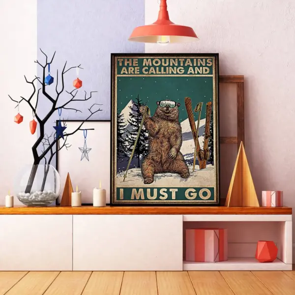 Skiing Poster Vintage Skiing Poster The Mountains Are Calling And I Must Go Vintage Poster Funny Bear Poster Bear Skiing Poster