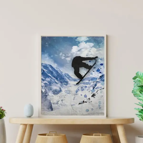 Capture the exhilaration of snowboarding with this high-energy art print featuring a snowboarder mid-flight against a stunning mountain backdrop. Perfect for sports enthusiasts.