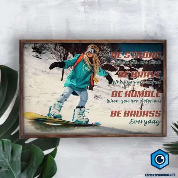 Inspiring wall decor featuring a dynamic snowboarding girl design. Motivational winter sports poster perfect for home or office, celebrating strength and adventure.