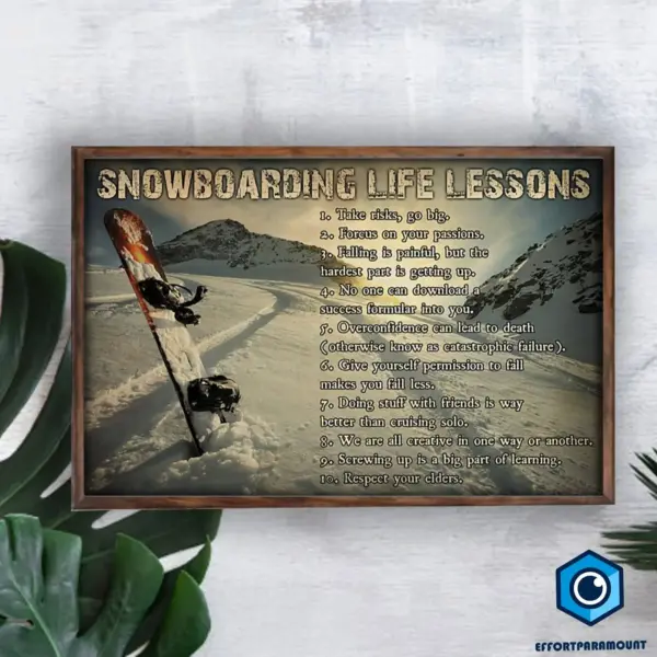 Capture the spirit of winter sports with this inspiring snowboarding poster featuring motivational life lessons and stunning mountain landscape design for home decor.