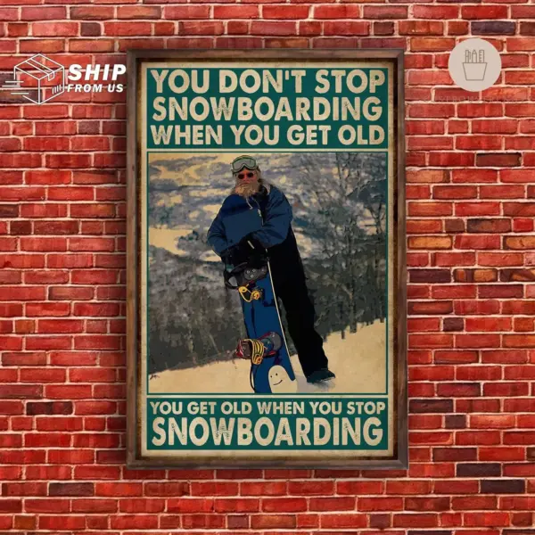 Motivational wall art for snowboarding enthusiasts celebrating passion that transcends age, perfect for home decor and winter sports lovers.