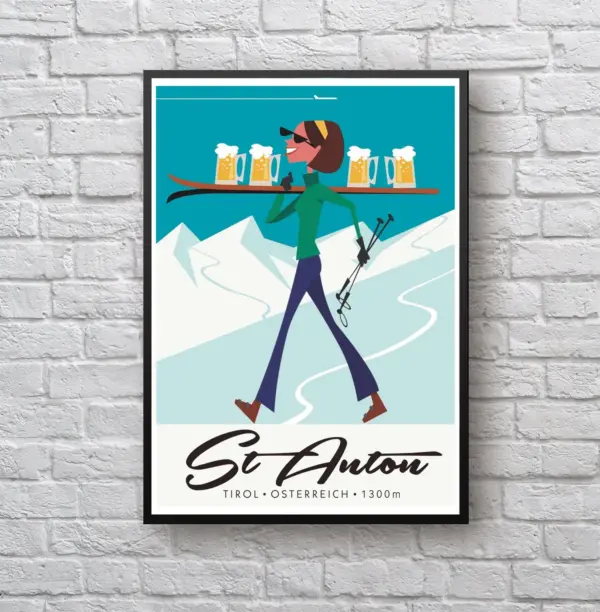 Capture the stunning alpine landscape of St Anton with this authentic ski resort travel poster featuring breathtaking mountain scenery and winter sports charm.