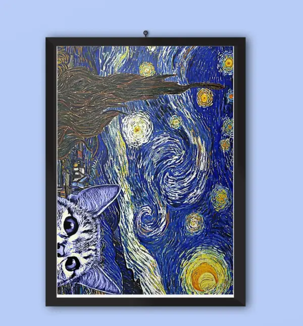 Starry Night Cat Kitten Poster Framed Matte Canvas