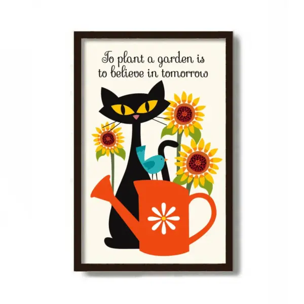 Sunflower Decor Art Print Fairy Garden Cat Gardening Gift Gardener Gift Mid Century Modern Art Print Black Cat Lover Gift Watering Can