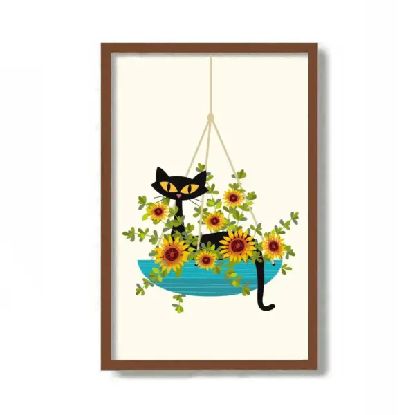 Sunflower Decor Hanging Flower Basket Planter Black Cat Art Print Garden Cat Gardener Gift Mid Century Modern Wall Art Cat Lover Gift
