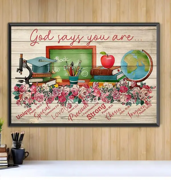 Teacher Flower Poster God Says You Are Unique Special Lovely Precious Strong Chosen Forgiven