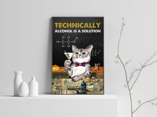 Technically Alcohol Is A Solution Poster Cat Drinking Poster Wine Wall Art Cat Art Print Printable Wall Art Signs For Home