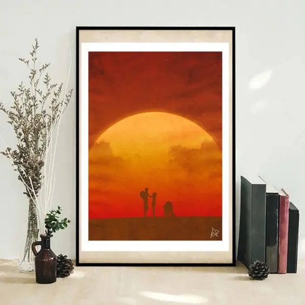 Minimalist Star Wars poster featuring a stunning sunset scene. Perfect wall art for teens and Star Wars fans. High-quality print.