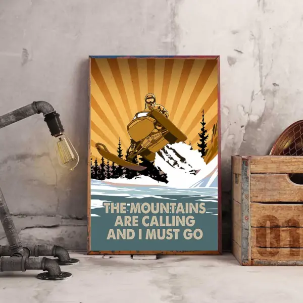 Capture the spirit of winter adventure with this vintage-inspired snowmobile poster featuring stunning mountain landscape and nostalgic winter sports design.