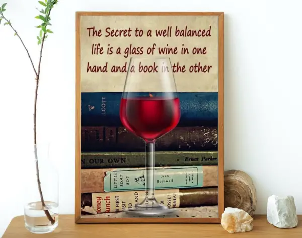 The Secret To A Well Balanced Life Is A Glass Of Wine Book Poster Book Lover Wine Lover Vertical Poster No Framed