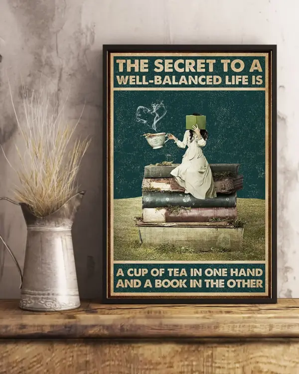 The Secret To A Well Balanced Life Tea And Book Vertical Poster Girl Love Books Vintage Wall Art Book Lover Poster No Frame