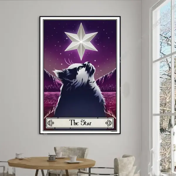 Miniature tarot poster featuring a feline design and a "Star Deadly" theme. Perfect for tarot enthusiasts and cat lovers. High-quality print on durable paper.