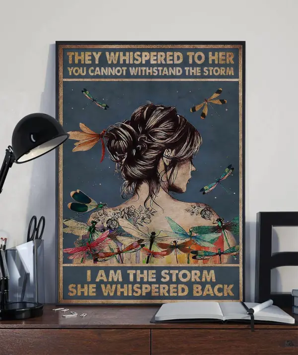 They Whispered To Her You Cannot Withstand The Storm I Am The Storm Poster Retro Girl Art Dragonfly Print Quote Poster Poster Frames