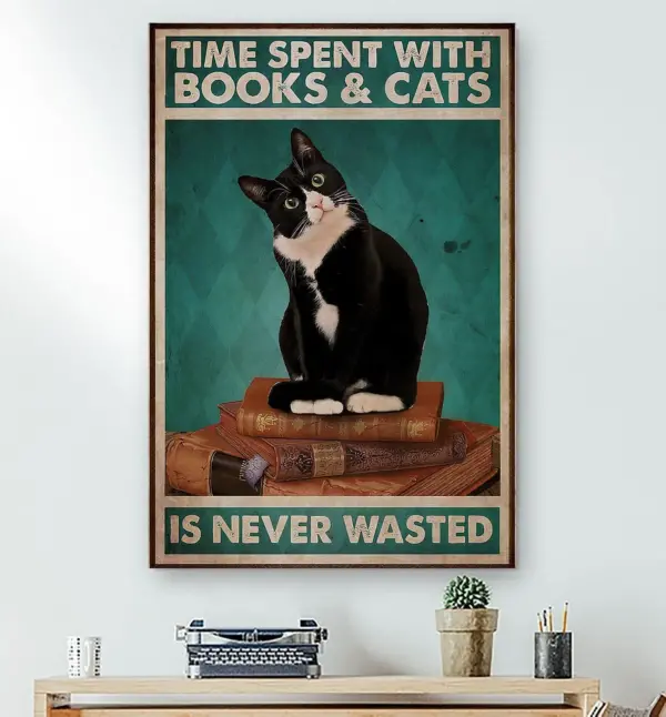 Time Spent With Books And Cats Is Never Wasted Poster Tuxedo Cat Print Love Cats Poster Love Book Poster Cat Lover Gift Vintage Poster