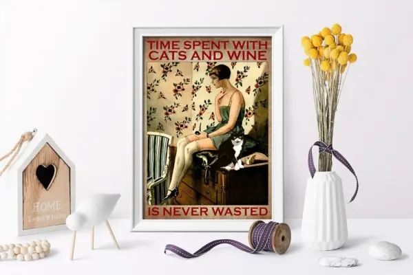 Time Spent With Cats Wine Is Never Wasted Poster Cat Poster Cat Drinks Wine Print Bathroom Decor Wine Poster Print Funny Cat Art