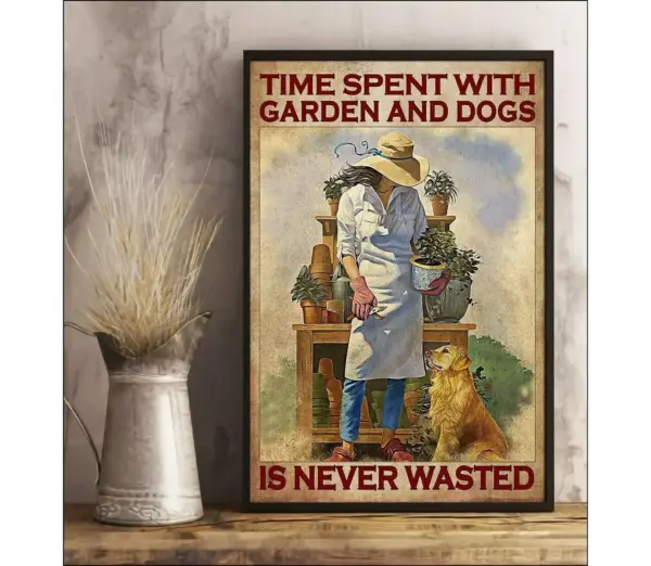 Vintage Gardening Poster Time Spent With Garden And Dogs Is Never Wasted Print Garden Lovers Gift Lovely Girl Wall Art Love Dogs Poster