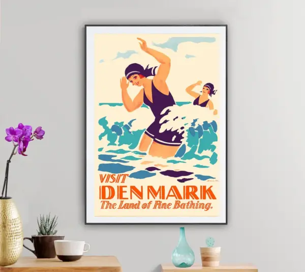 Visit Denmark The Land Of Fine Bathing Vintage Travel Poster Poster Paper Sticker Or Canvas Print Gift Idea