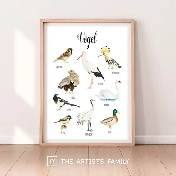 Vogel Downloadable Prints Watercolor Montessori Educational Posters Kids Boys Girls Children Learning Painting Illustration German Deutsche