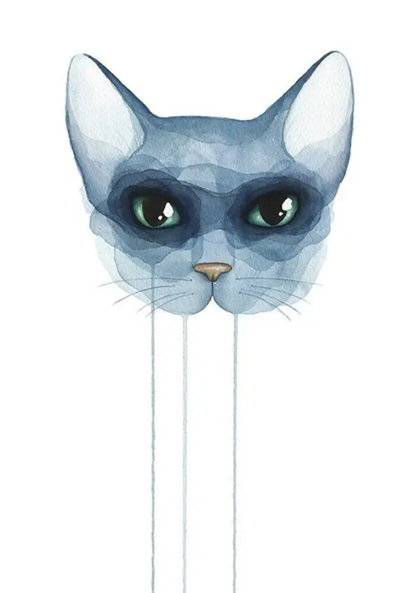 Watercolor Cat Poster Blue Fantasy Dripping Animal Print Big Eyes Painting