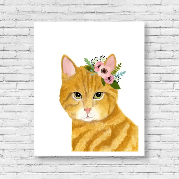 Watercolor Orange Tabby Cat Flower Crown Cat Animal Paintings Watercolor Animal Woodland Kids Poster Kitten Painting Cat Painting