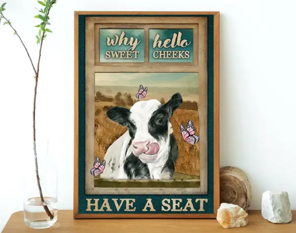 Why Hello Sweet Cheeks Have A Seat Bathroom Decor Poster Cutie Cow Cow Lover Animal Lover Vertical Poster No Framed