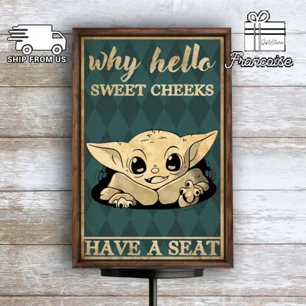 Funny Yoda Star Wars bathroom poster featuring a cheeky quote. Perfect toilet decor for Star Wars fans. Unique and humorous design.