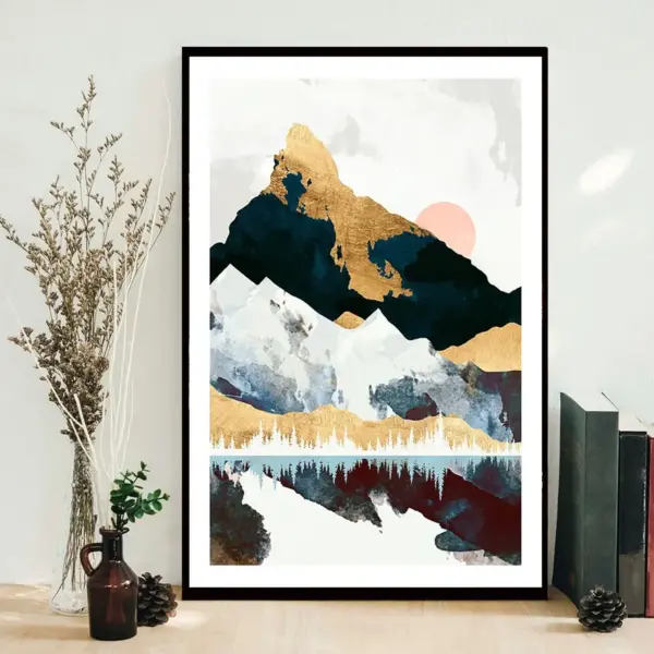Winter Day Poster Graphical Mountain Reflection Landscape Poster With Mountains And A Moon Reflecting In A Lake Mountains Poster Wall Art