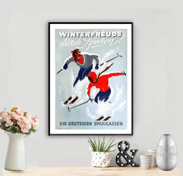 Winterfreude Durch Sparen Die Deutschen Sparkassen Vintage Ski Poster Poster Paper Sticker Or Canvas Print