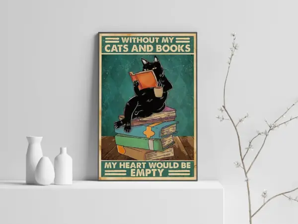 Without My Cats And Books My Heart Would Be Empty Poster Canvas Love Reading Books Black Cat Gift For Book Lover Funny Cat Print