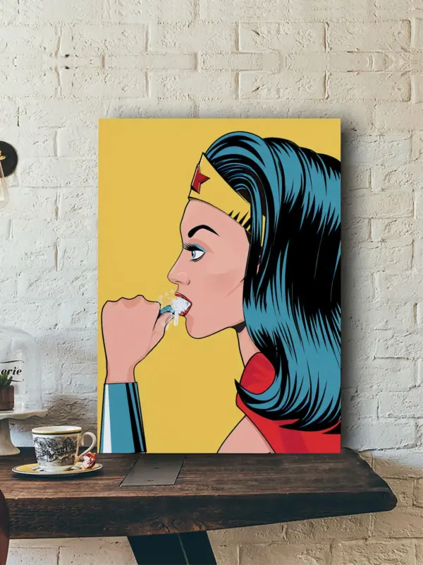 Humorous Wonder Woman poster perfect for bathroom decor. Features Wonder Woman promoting dental hygiene. Unique superhero-themed print for fun and functional bathroom art.