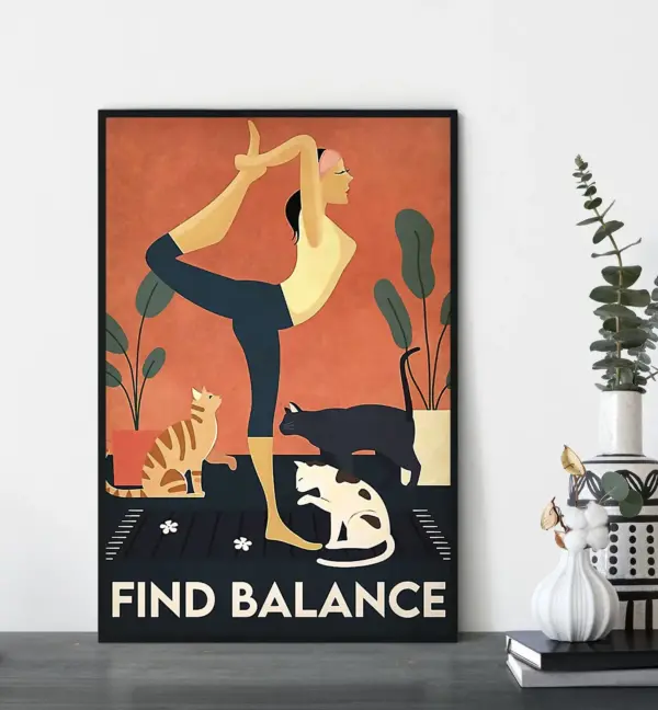 Yoga Poster Find Balance Poster Girl And Cats Art Lovely Girl Poster Girl Loves Yoga Print Yoga Lovers Gift Funny Cats Art 1407