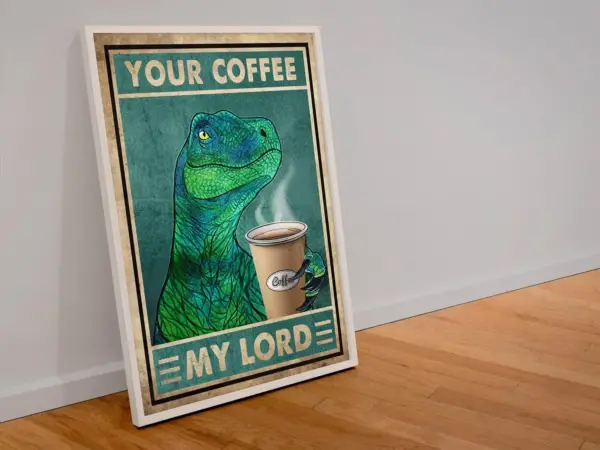 Your Coffee My Lord Funny Velociraptor Poster Caffeine Addict Art Print Dinosaur Lover Canvas Art For Home And Kitchen Decor
